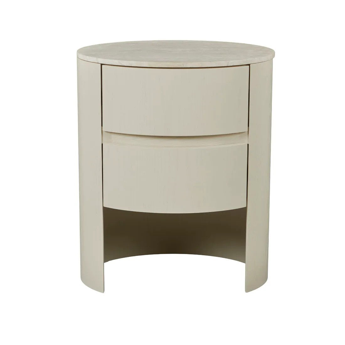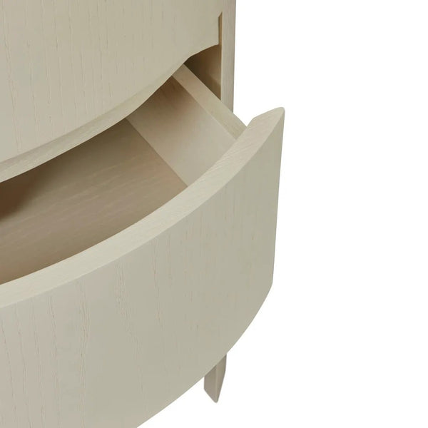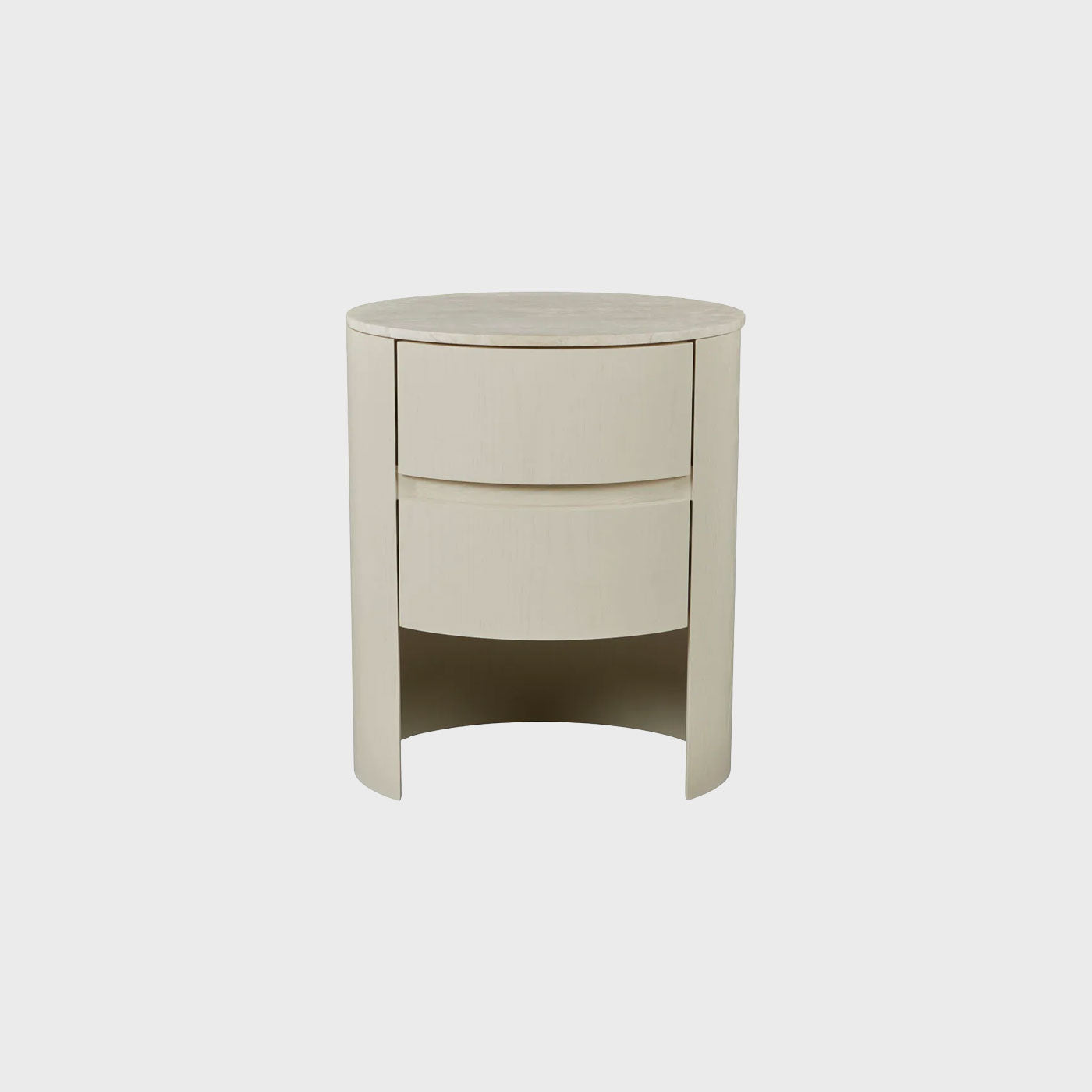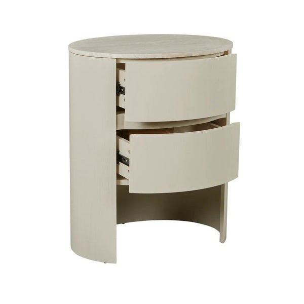 Fluid curves define the Oberon Lune Marble Bedside, showcasing natural materials in travertine paired with natural ash veneer. Two smoothly curved drawers feature finger pull handles, delivering practical storage wrapped within sophisticated oval form. Contemporary proportions blend perfectly into modern bedroom spaces through considered design details. Generous sizing suits taller bedroom ensembles, making this piece both functional art and practical luxury.