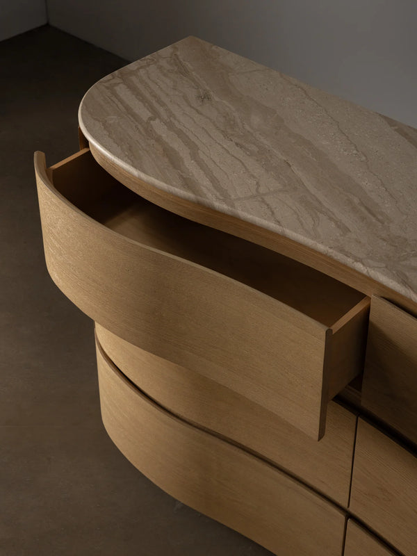 To give a solid form the movement and shape of water - to craft wood into an impossibly beautiful curve - is as much about poetry as it is craftsmanship, and requires as much skill as it does vision. The Remy Dresser achieves just this. Sophisticated and unending, its simple lines have a quiet, affecting impact - a resonance that is matched materially, through the timelessness of its marble stone top.