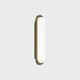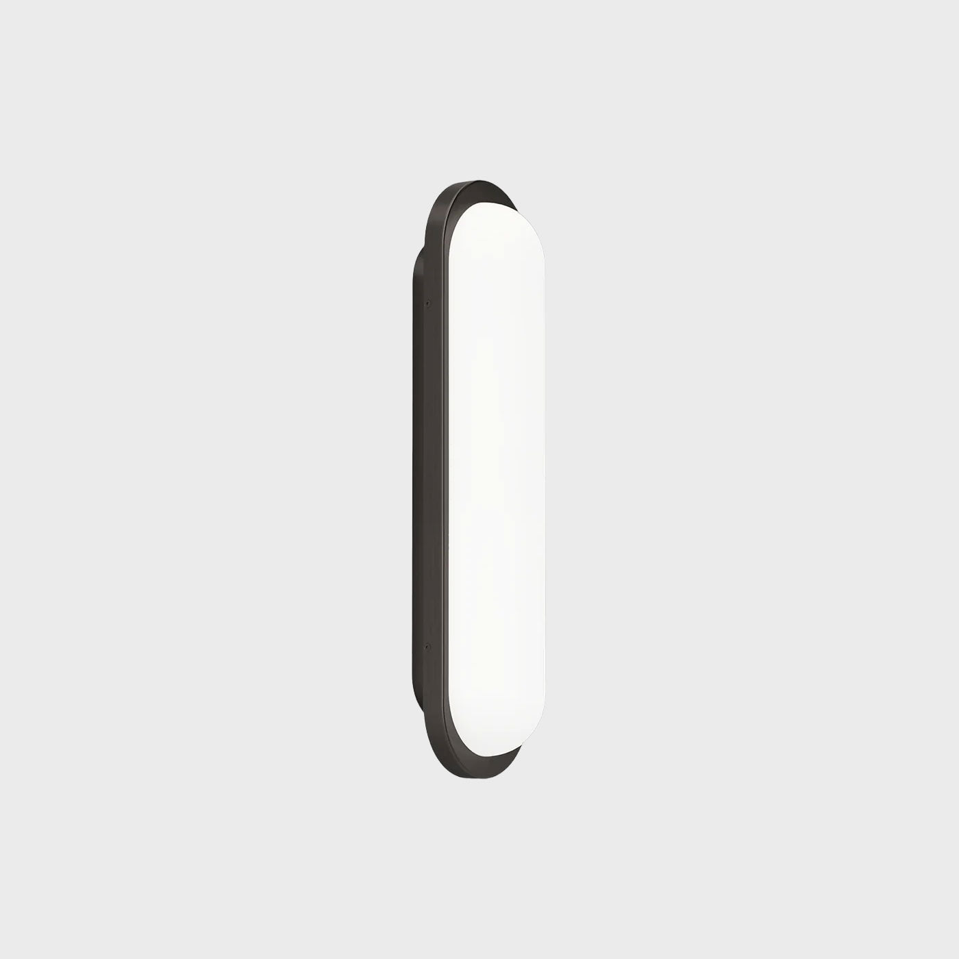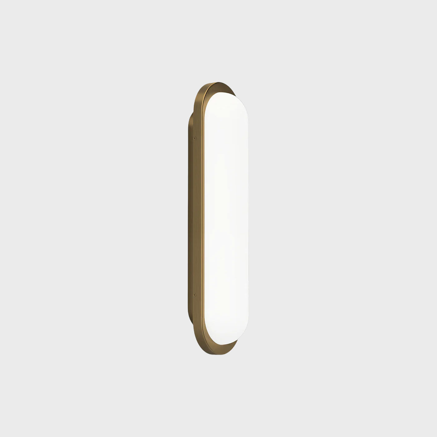 The elongated white glass shade is encased by an aluminium frame available in either an Old Brass or Iron finish.