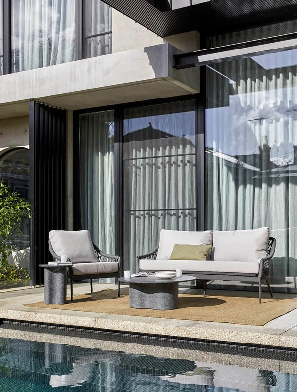 Modern and curve driven, this outdoor coffee table offers style and attitude to complete a seating area. Crafted in fibrestone with a curving base it's the perfect piece to make a statement and add contemporary flair.