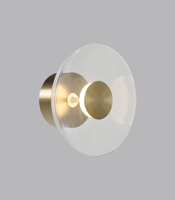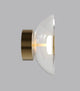 Dome Air Wall Light by Lighting Republic features a borosilicate glass shade and a central brass accent. A refined brass rod intersects the shade, housing a radiant dimmable LED light source. Exuding sophistication and contemporary flair, its minimalist aesthetic lends it a timeless and versatile appeal for any interior space.