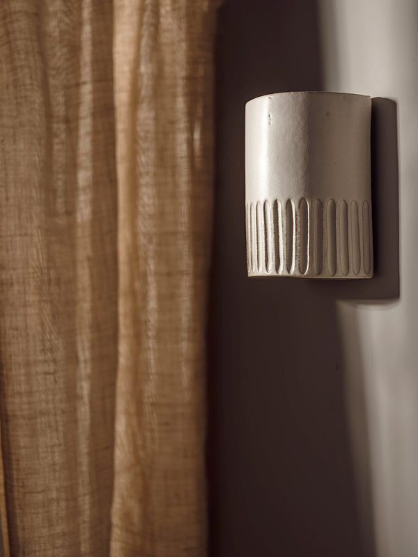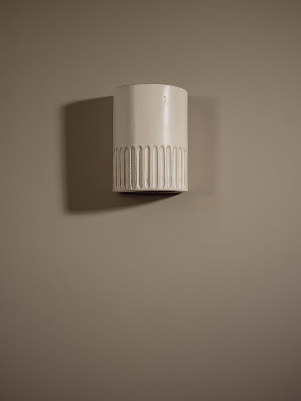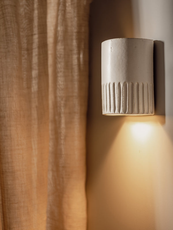 The Day Short Interior Ceramic Wall Light from We Ponder is designed to bring warmth and ambience to your interior space. 'Day' once formed by hand is then carefully carved to create a stunning inverted corduroy pattern to the lower third. The smooth ceramic is carefully dipped into an eggshell white low sheen glaze and kiln fired to ensure strength and durability. Due to the handmade nature of these wall lights, you might expect to find slight variations in size, glaze finish and form including unique beauty spots and natural inconsistencies.Â
