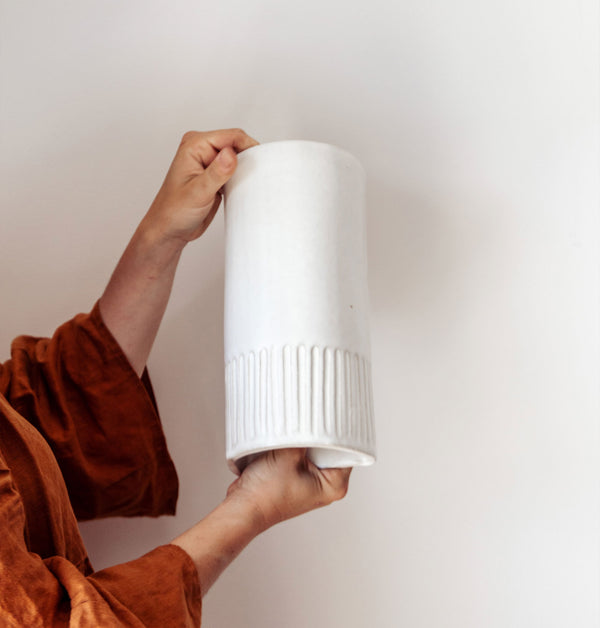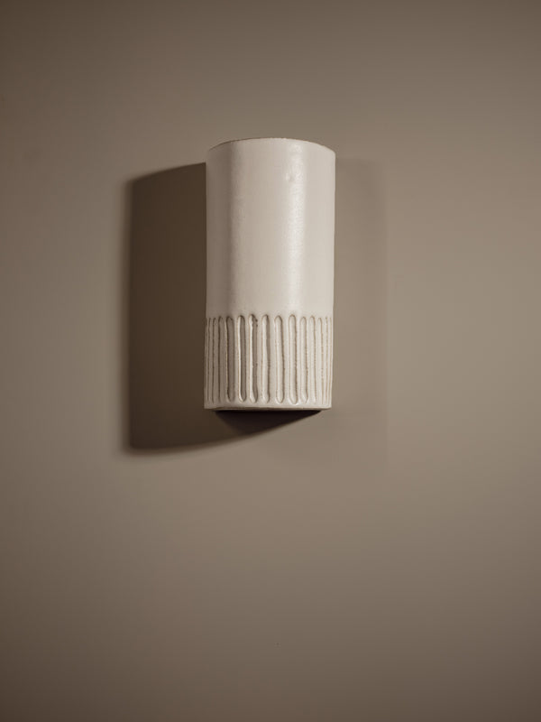 The Day Tall Interior Ceramic Wall Light from We Ponder is designed to bring warmth and ambience to your interior space. 'Day' once formed by hand is then carefully carved to create a stunning inverted corduroy pattern to the lower third. The smooth ceramic is carefully dipped into an eggshell white low sheen glaze and kiln fired to ensure strength and durability. Due to the handmade nature of these wall lights, you might expect to find slight variations in size, glaze finish and form including unique beauty spots and natural inconsistencies.